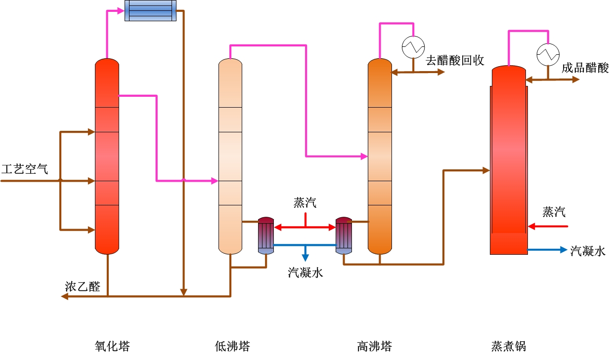 濃乙醛自塔底送入氧化塔,同時加入醋酸錳,氧化塔分為五段,每段均通入空氣,在氧化塔內,乙醛被氧化成醋酸,塔頂未反應氣體進冷凝器,冷凝液回氧化塔底,不凝氣排放,粗醋酸送入低沸器。在低沸塔內,醋酸錳被分離下來,送回氧化塔,塔頂醋酸蒸汽自塔中部進入高沸塔。乙酸甲酯等低沸物在高沸塔內上升至塔頂,冷凝后部分采出的稀酸送入蒸發鍋。在蒸發鍋內,醋酸被蒸發自塔頂,冷凝、冷卻后即得到成品醋酸,塔釜少量高沸物定期清理。