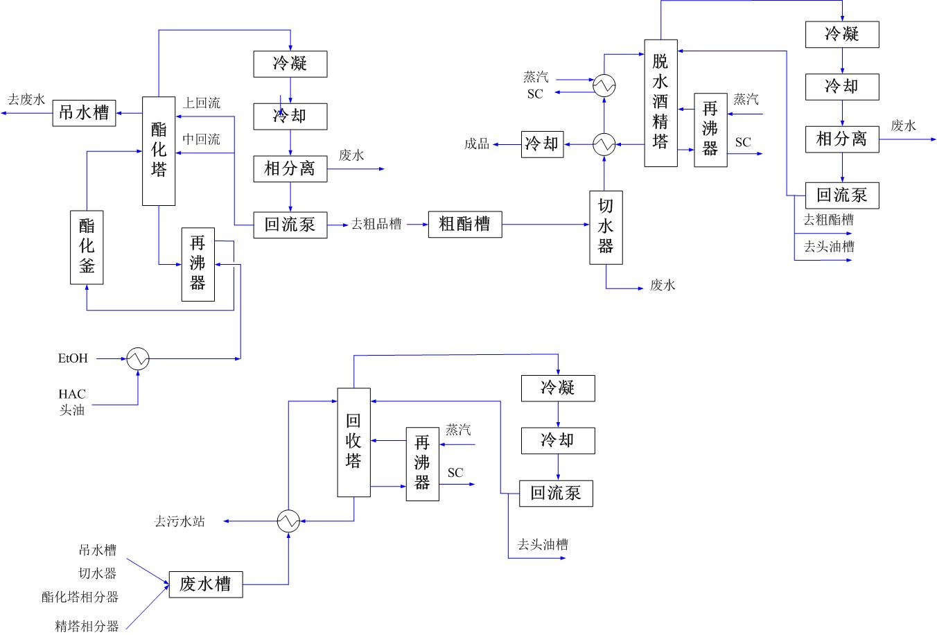 乙酸乙酯的生產(chǎn)過(guò)程包括:配料、酯化、分相、脫水、精制、回收等步驟。乙酸與乙醇按一定比例混合進(jìn)入酯化釜內(nèi),然后向酯化釜加入濃硫酸催化劑進(jìn)行酯化反應(yīng),反應(yīng)后的產(chǎn)物進(jìn)入酯化塔,汽相的乙酸乙酯和水經(jīng)塔頂冷凝器冷卻后進(jìn)入分相器分相得到粗酯。粗酯再經(jīng)過(guò)脫水塔系統(tǒng)、精餾塔系統(tǒng)得到成品乙酸乙酯。與此同時(shí)回收塔系統(tǒng)對(duì)廢水中的酯、醇進(jìn)行回收?;厥蘸蟮孽?、醇去配料。