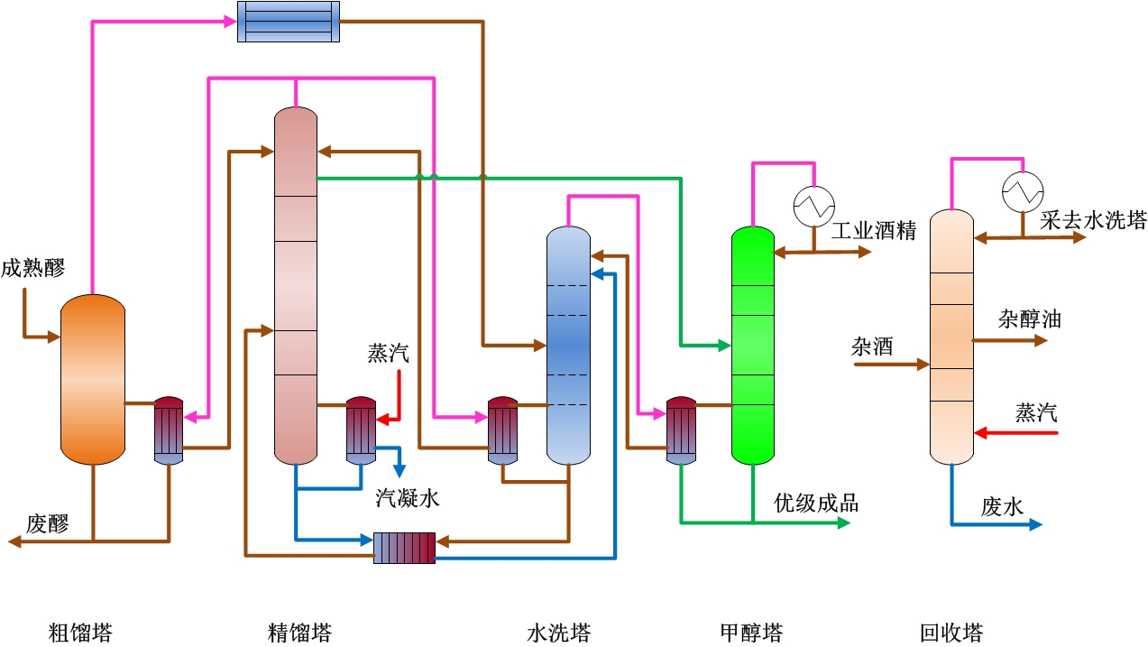 配置粗餾塔、水洗塔、精餾塔、甲醇塔、回收塔,其中精餾塔采用蒸汽供汽,精餾塔塔頂酒汽供熱粗餾塔和水洗塔,水洗塔塔頂酒汽供熱甲醇塔,粗餾塔和回收塔塔頂酒汽預(yù)熱成熟醪。
